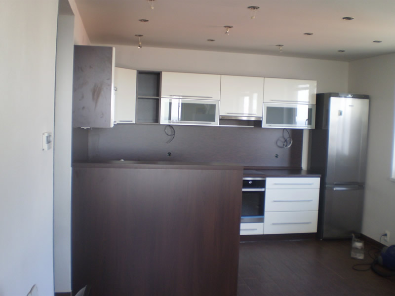 Rohová kuchynská linka do U s barovým pultom do rodinného domu. Moderná kombinácia farieb - lakované striekané biele lesklé dvierka a drevodekor Wenge Egger. Kuchynská linka v tejto novostavbe je doplnená hliníkovým rámikom, drevenou zástenou, Wenge pracovnou doskou, nerezovou chladničkou a rohovým drezom značky Blanco.